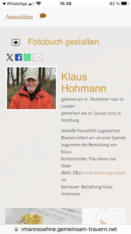 Anstelle freundlich zugedachter Blumen bitten wir um eine Spende zugunsten der Bestattung von Klaus.